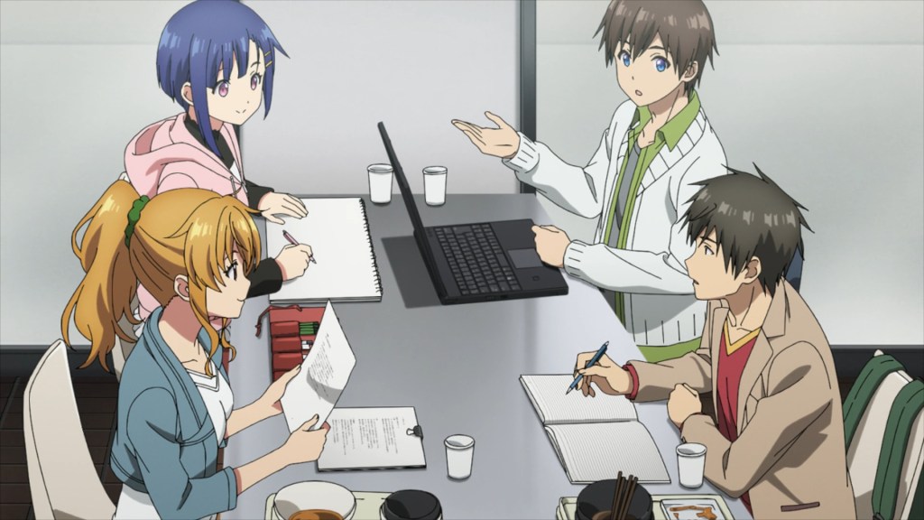 Sharing a house with fellow classmates with Aki Shino, Nanako Kogure, and Tsurayuki Rokuonji, this was going to be the start of something new. From composing scripts to brainstorming character designs to creating proper games, we genuinely enjoyed watching Kyouya and his classmates’ adventures. Like any typical college scenario, we see Kyouya and his classmates having conflicts and running into technical resource issues with their assignments. But thanks to Kyouya’s future self and his knowledge, things magically work out with ease.