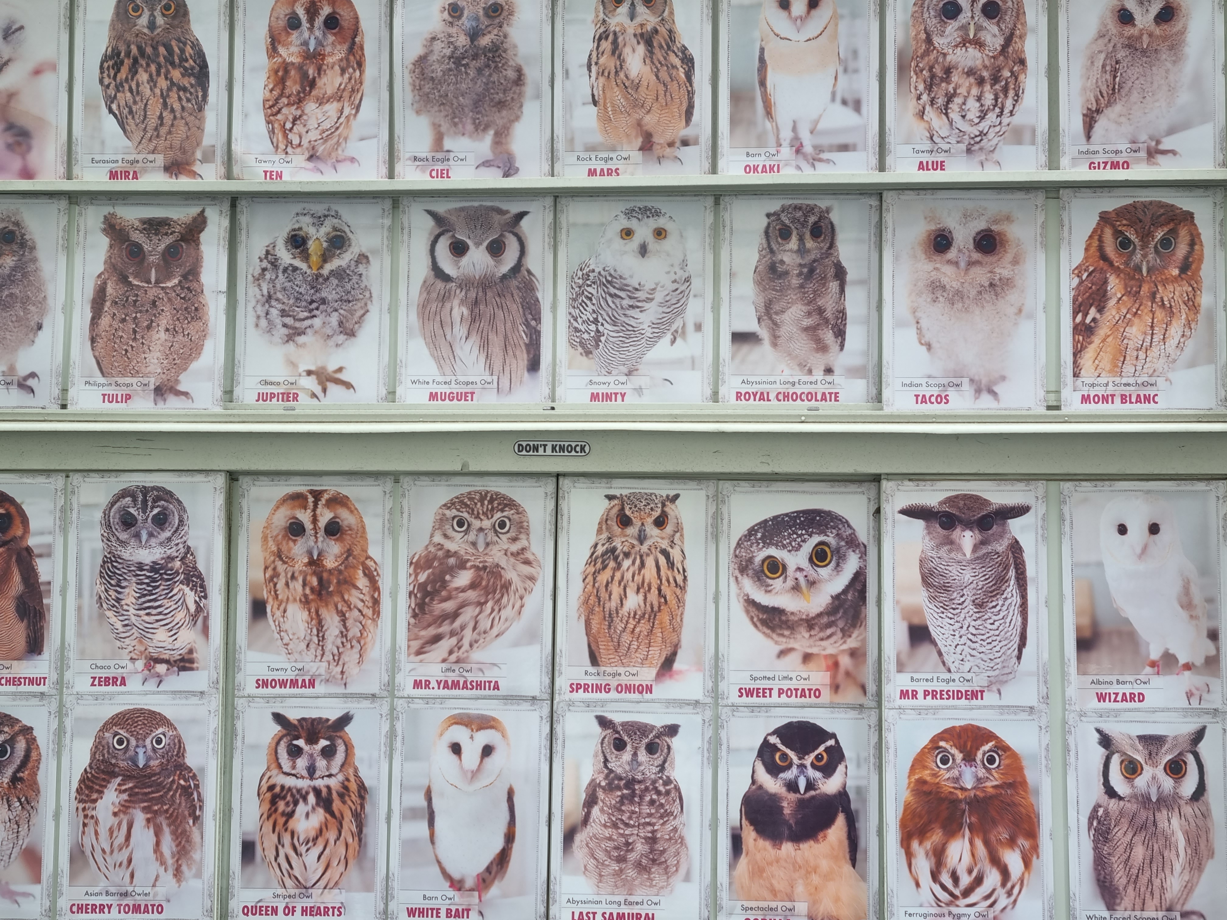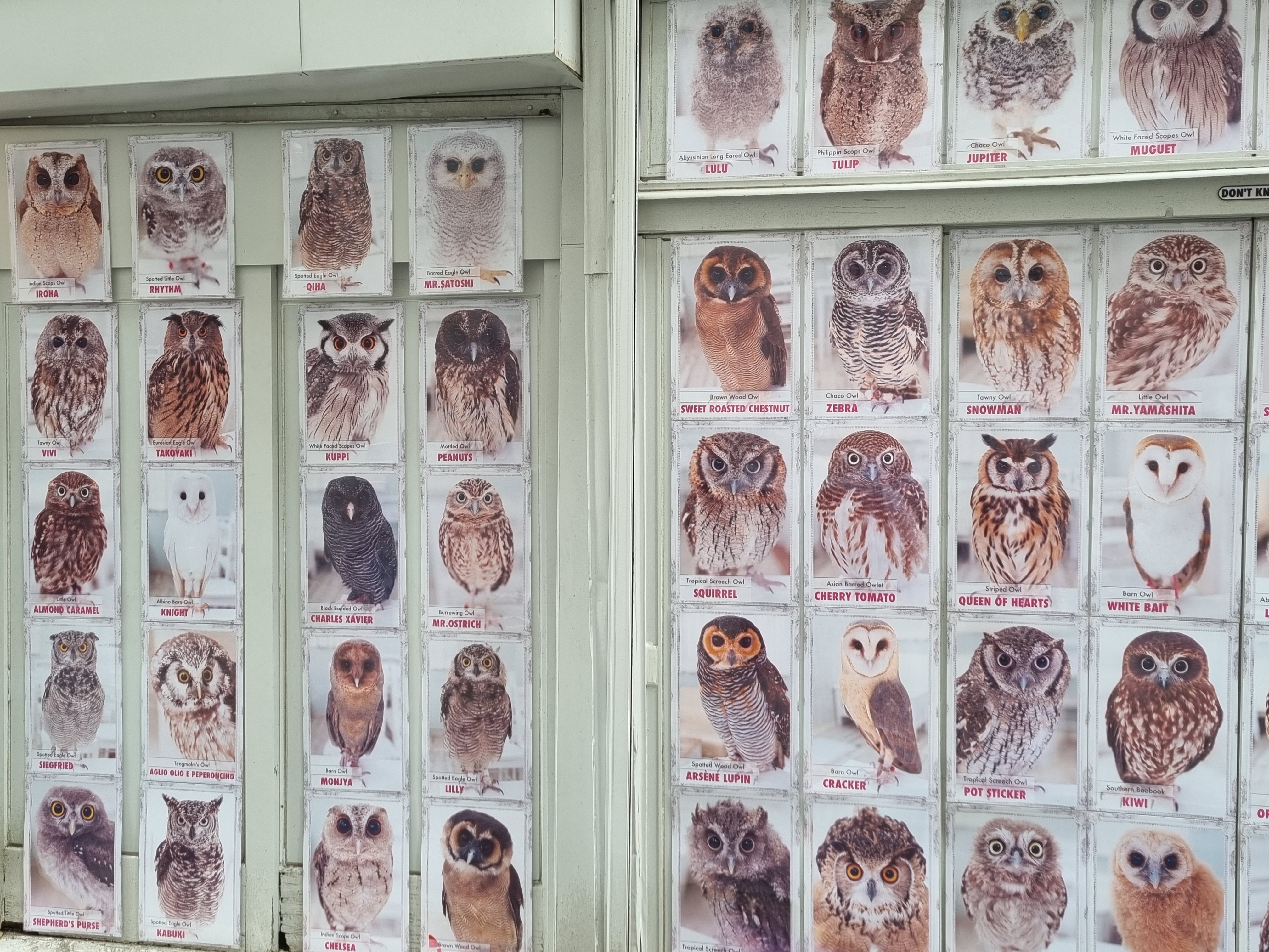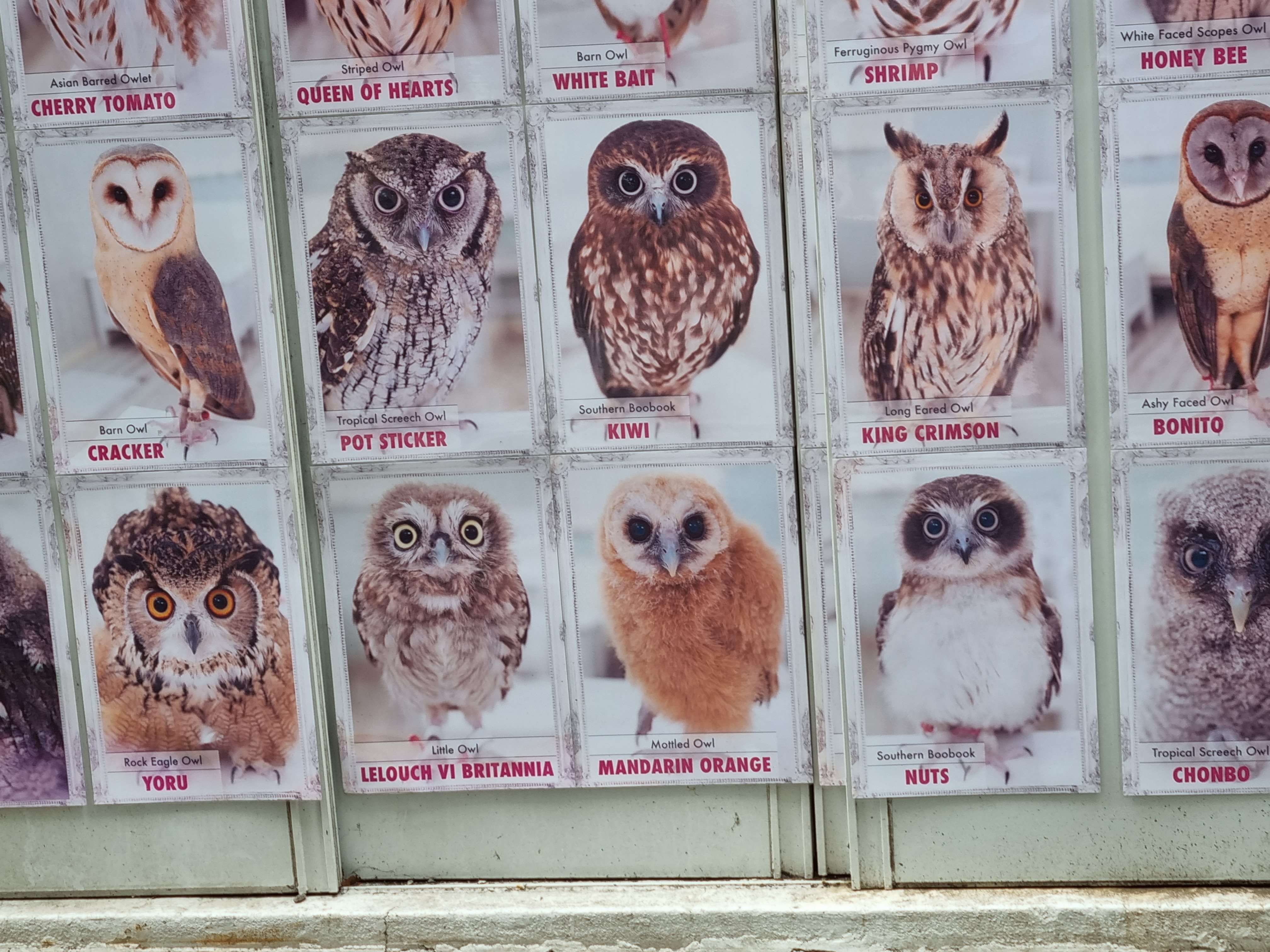 Look at the many types of owls and their chosen names! Spring Onion? White Bait? Tacos? Wizard? Mr President? Lelouch Vi Britannia??? We’re so amused by this!