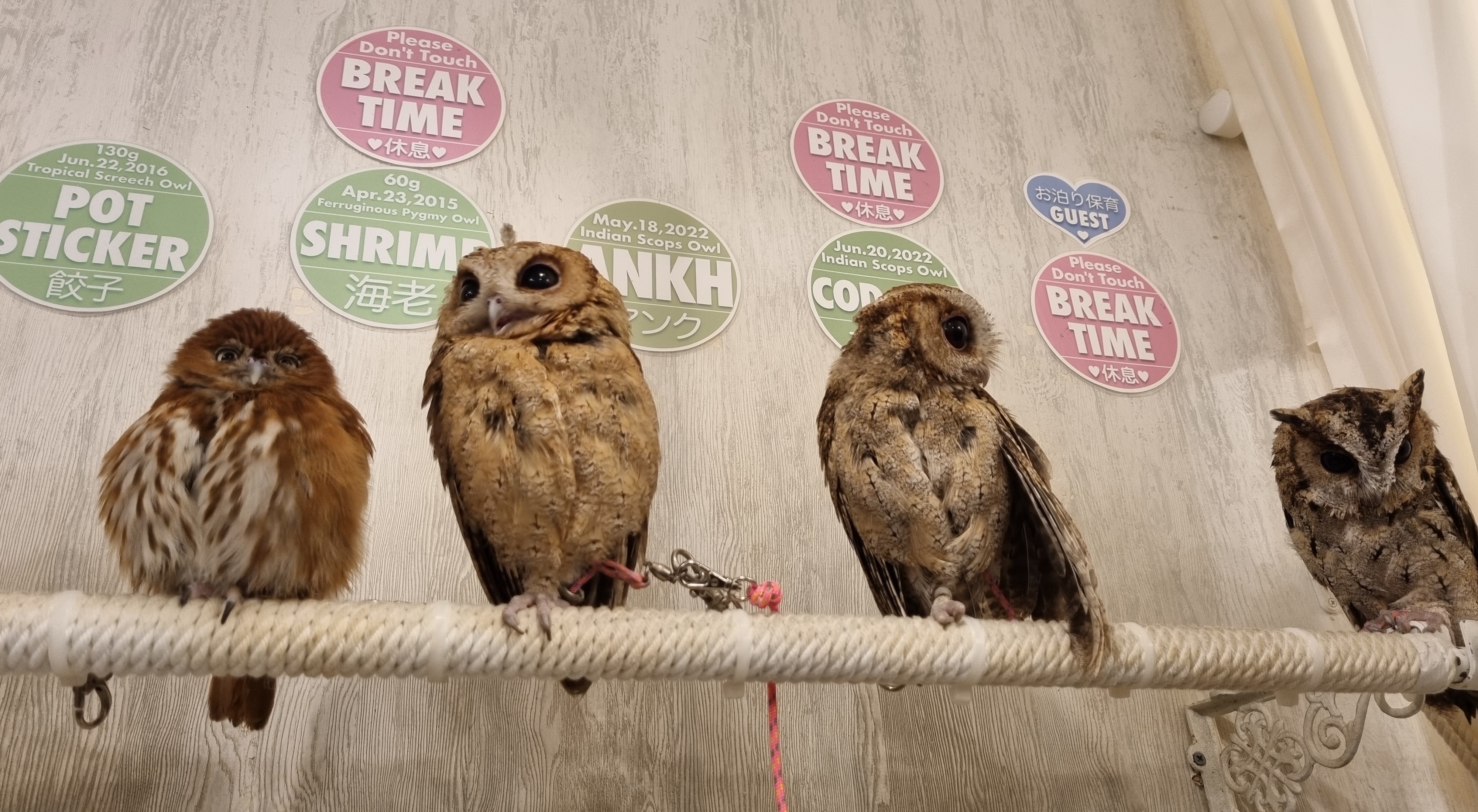 The moment we walked into the cozy cafe, we saw a bunch of owls sitting on a bird perch. There weren’t just one perch, but many! Owls to our left; owls to our right; and owls literally above our heads!